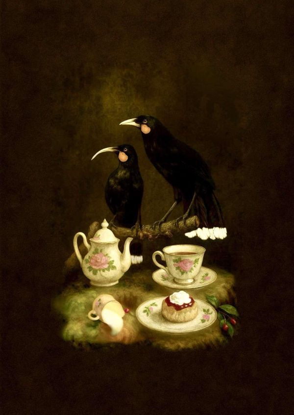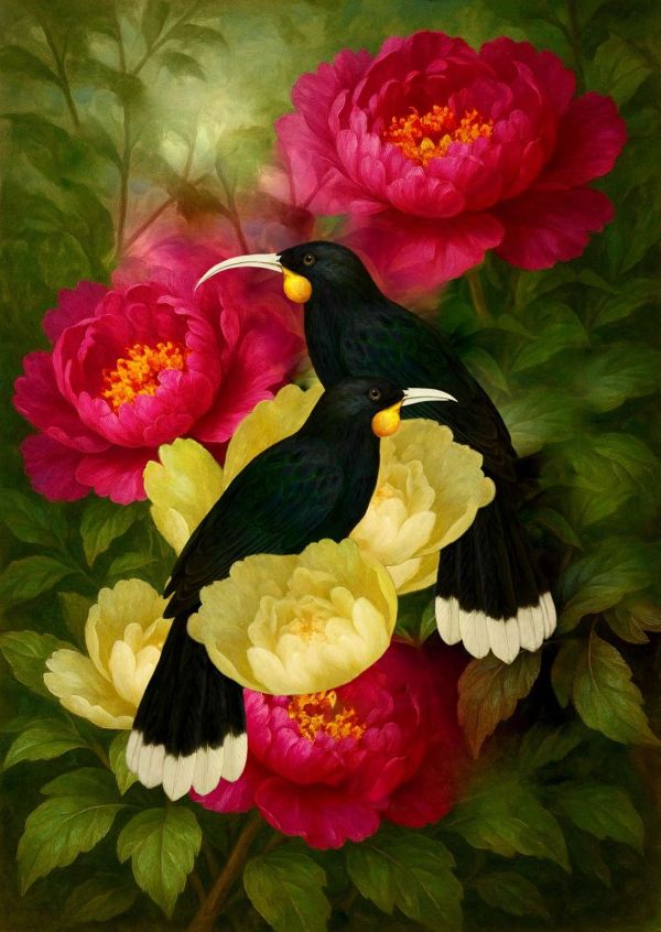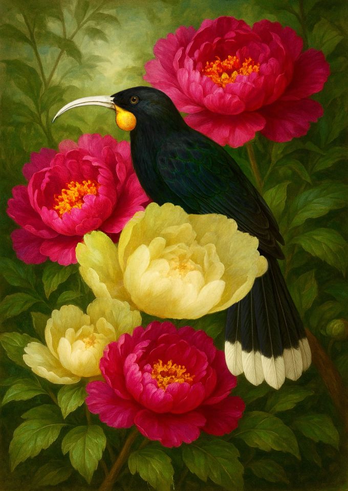 In May 2025, I presented my Huia Bird Portraits in my debut exhibition at Caccia Birch House in Palmerston North, reimagining Heteralocha acutirostris — the extinct Huia — through a Victorian floral romantic inspired lens. This body of work brought together fine art photography, digital collage, and gouache, forming a tribute to the grace and enduring beauty of the Huia.