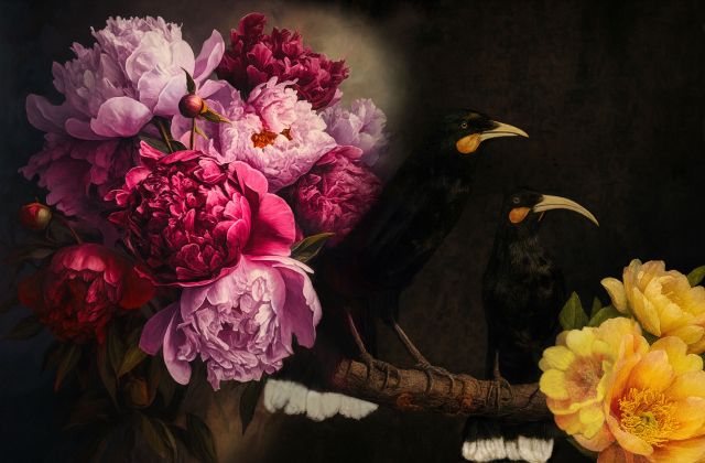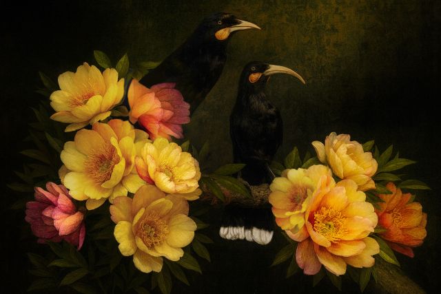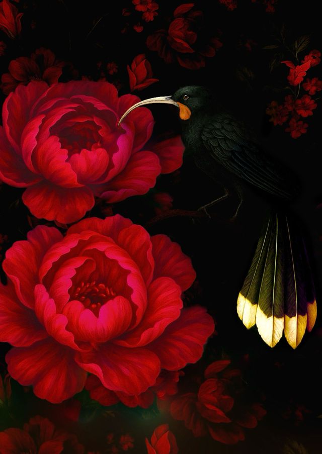 In May 2025, after a year in creation, I presented my very popular Huia Bird Portraits at my debut Exhibition at Caccia Birch House — reimagining the extinct Huia through a Victorian-inspired lens. The collection merged mixed media gouache, collage and fine art photography to celebrate the grace and enduring beauty of the Huia, adorned in Victorian floral romanticism and natural history references.